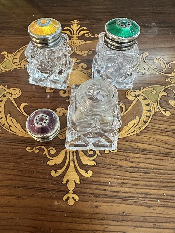 Saltbøsse i krystal , sterling sølv top med emalje ,
