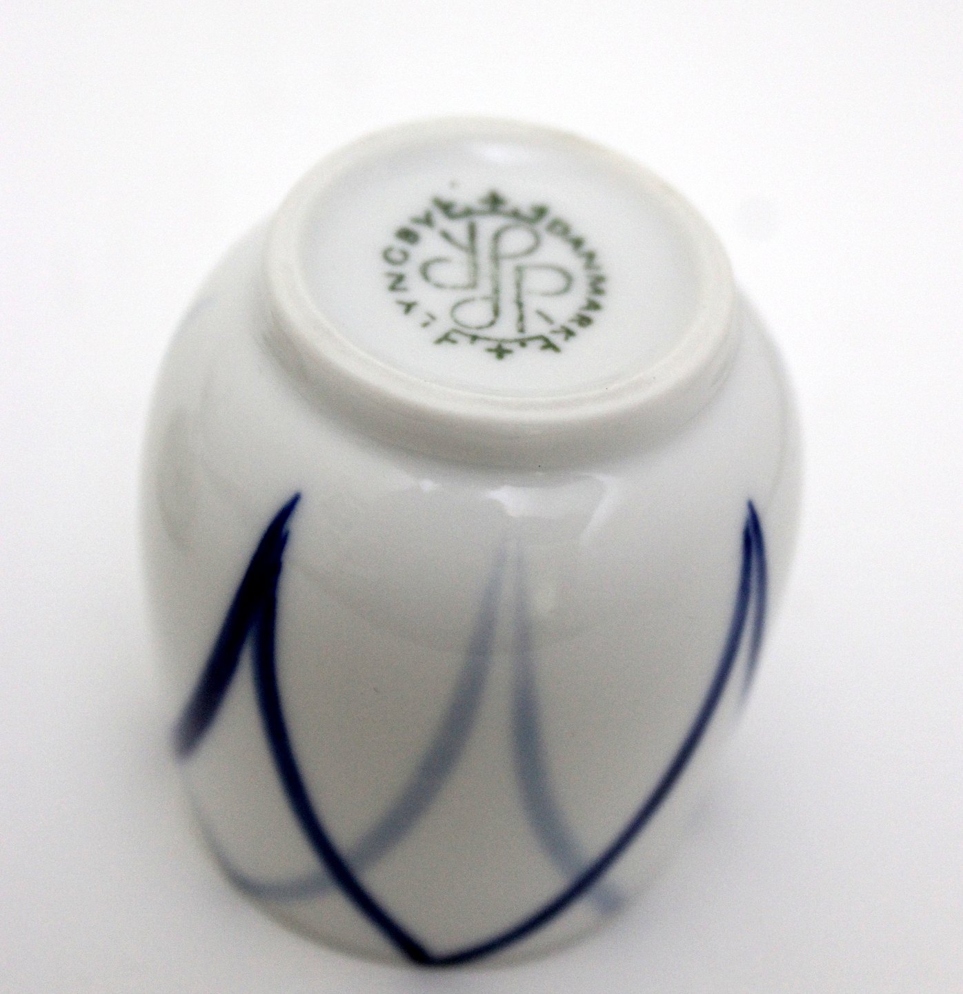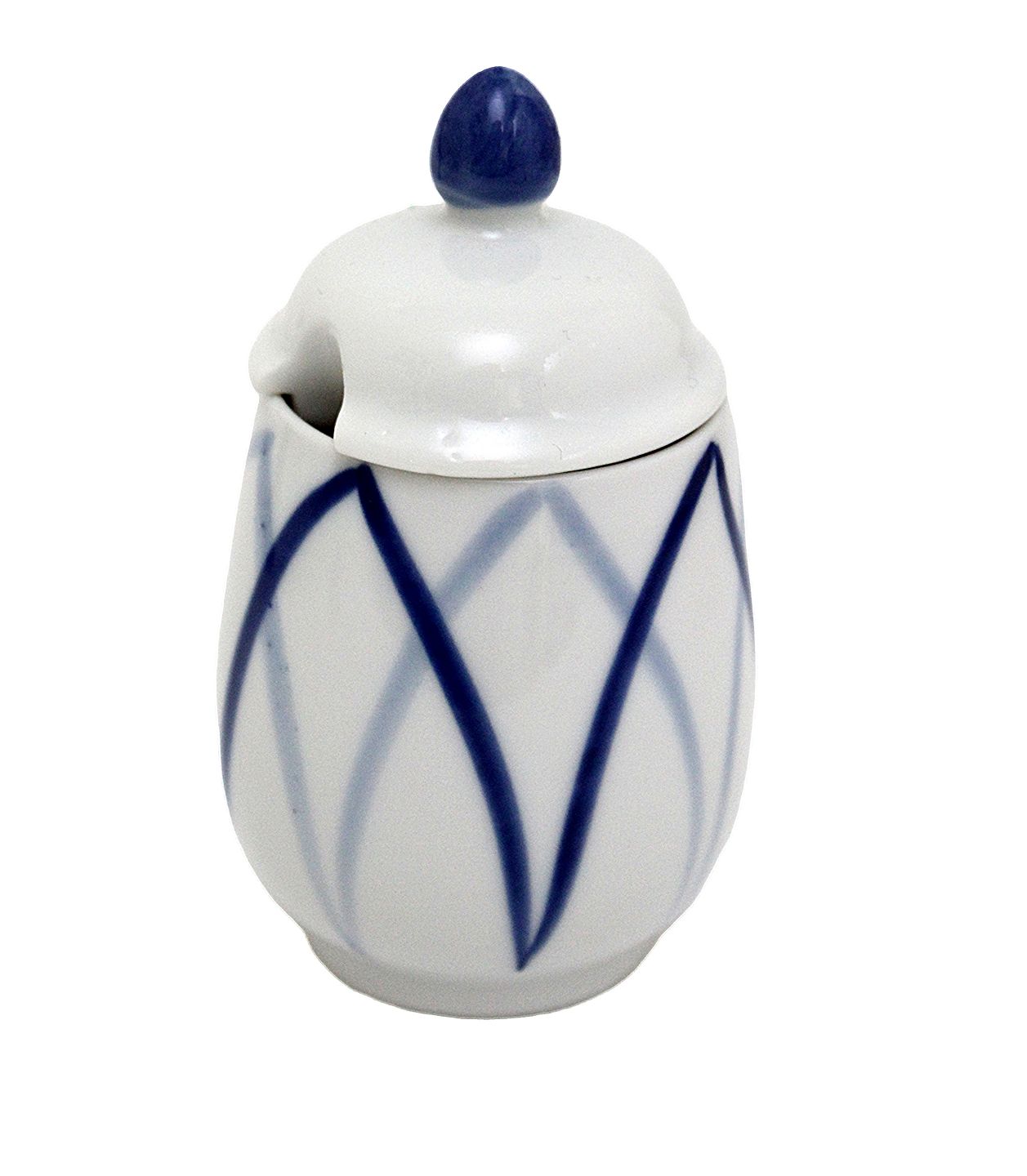 Dan-ild Lyngby, Harlekin/Blå flamme. Sennepskrukke med låg. Design Axel Brüel i 1958. Højde 9 cm. Diameter 4,5 cm. Pris: 150 kr. stk. Lager: 1