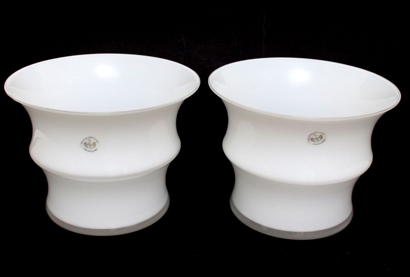 Højde 16 cm. Diameter 20,5 cm. Holmegaard label og signatur i bund. Pris: 550 kr. stk. Lager: 2