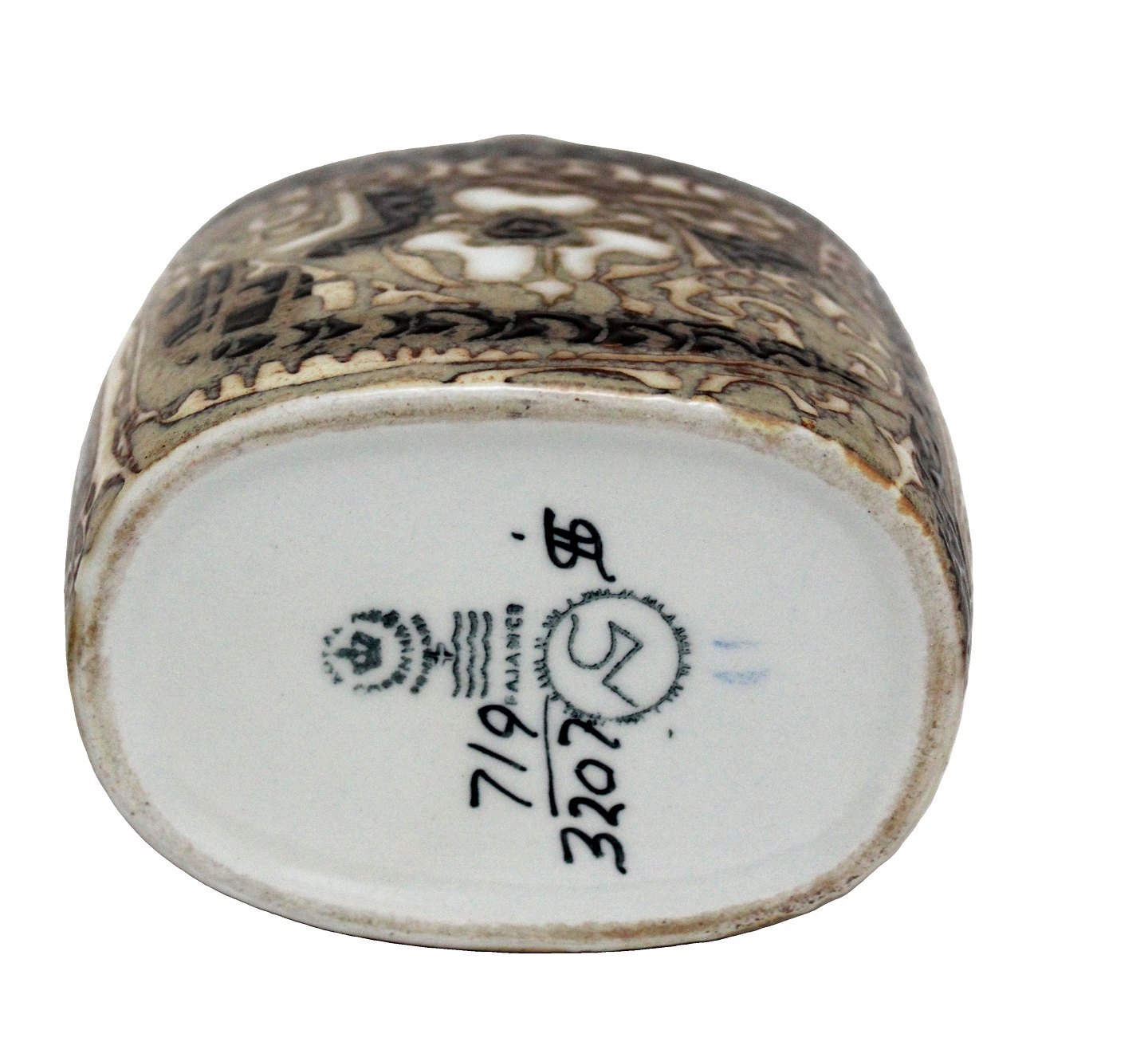 Royal Copenhagen, Baca Kunstfajance firkantet lille vase i brun og gylden glasur med Fiskemotiver på alle 4 sider. Designet af Nils Thorson. Nr. 719/3207. Højde 13 cm. Længde 10 cm. Bredde 6,5 cm. Top diameter 4,5 cm. II. sortering. Pris: 300 kr.
