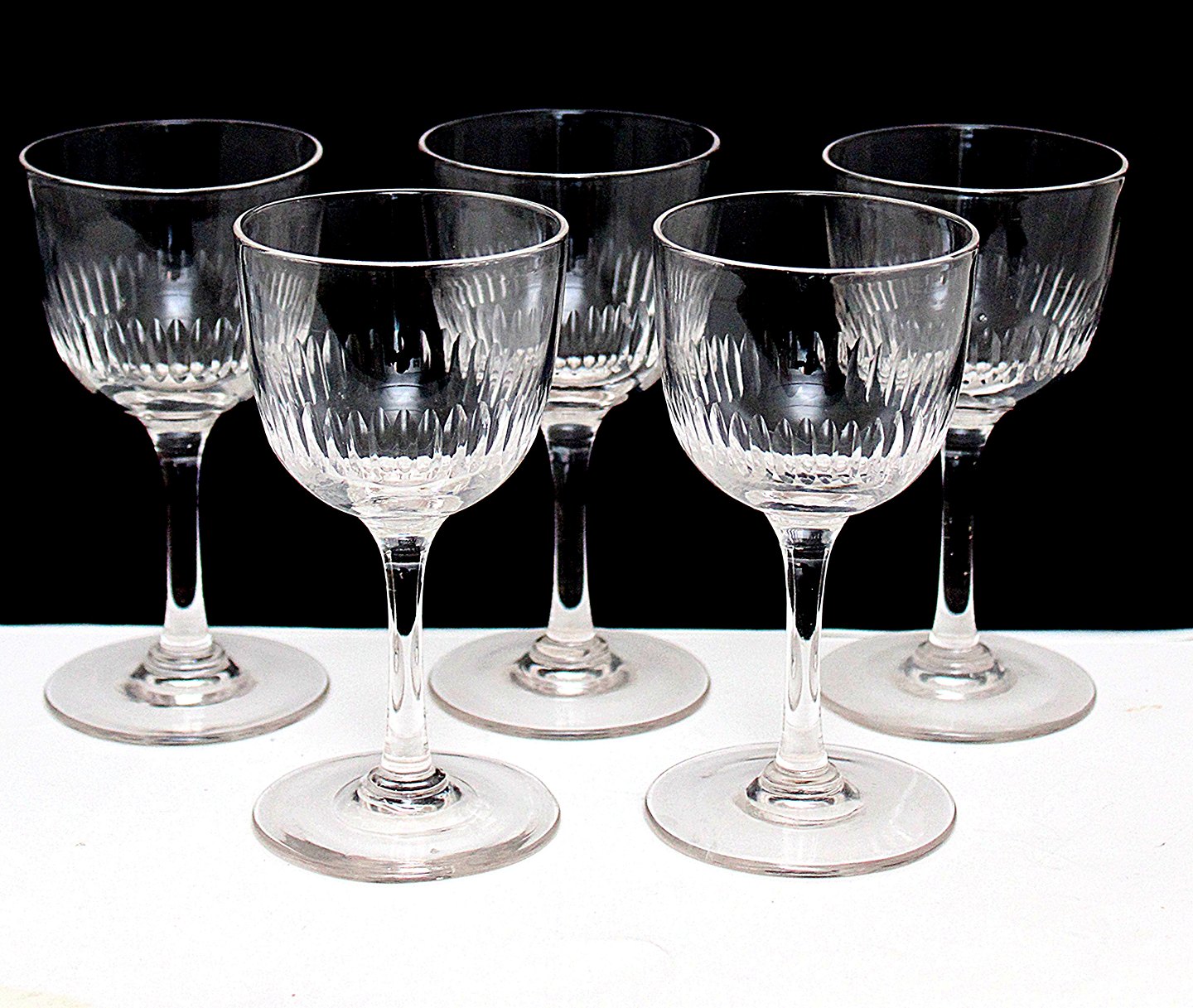 5 krystalvinglas med slibning nederst på kumme og glat stilk. Højde 12,5 cm. Diameter 6,5 cm. Lille hvidvin eller stor hedvin. Samt 1 stort snaps eller portvin. Højde 12,5 cm. Diameter 5 cm. Alle 6 glas pris: 475 kr.