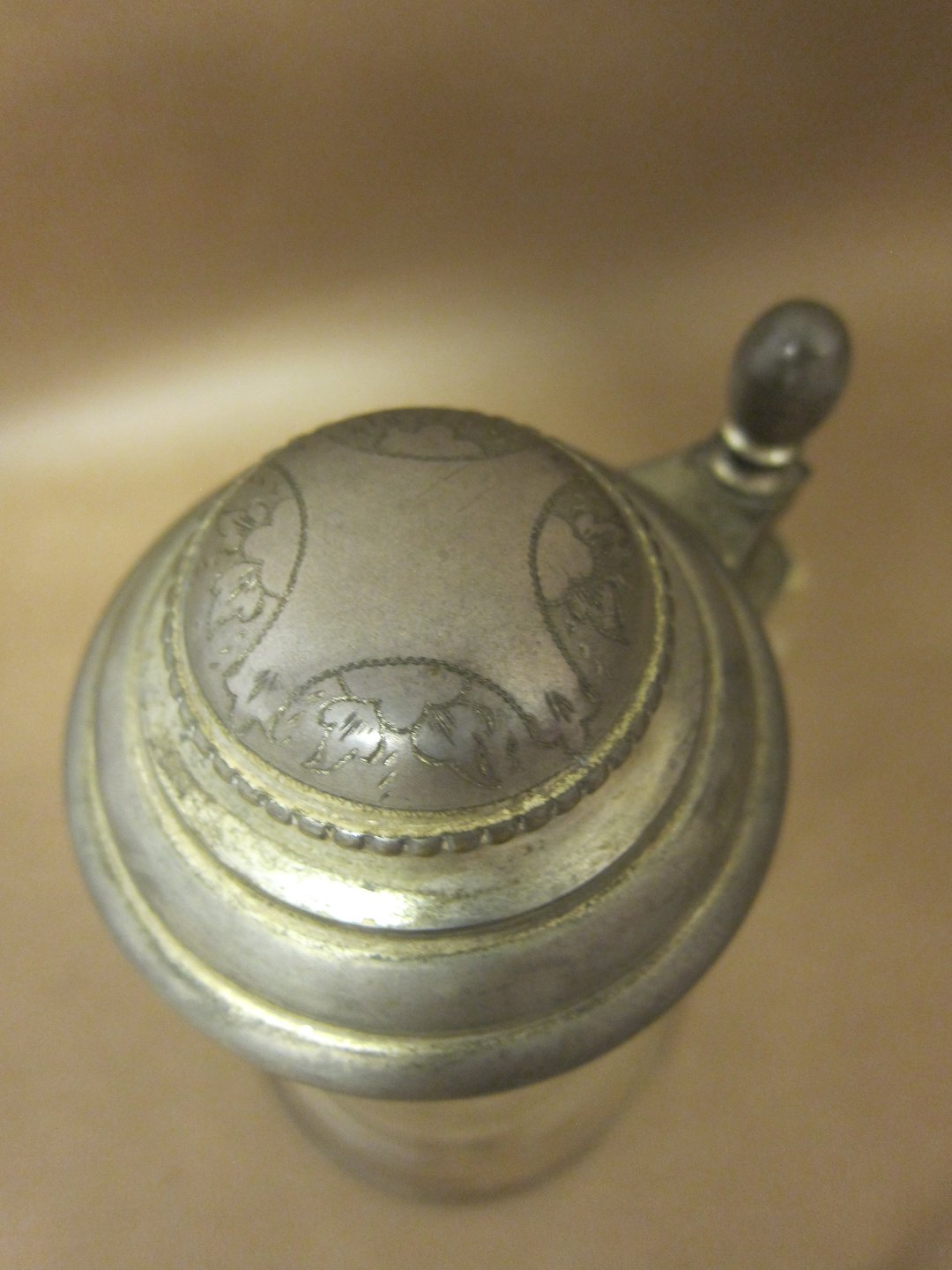 Mug/tankard, glass, with a lid made of pewter Dkr. 425,- each H.: 17,5cm (left) og 19,5cm (right) We have a large choice of antique glass Please contact us for further information Articlenr.: 1192