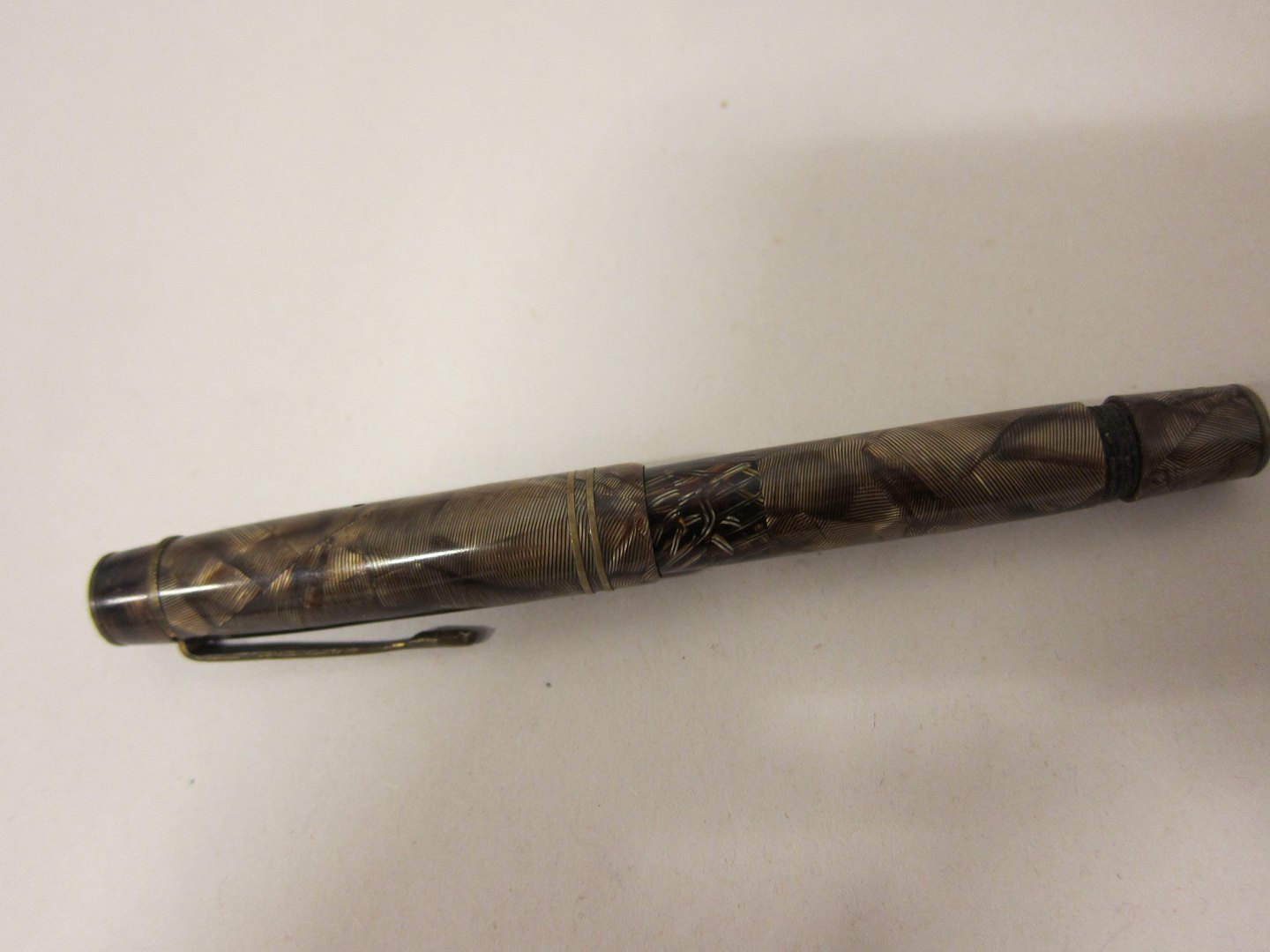 Fountain pen Brown marbled, Original Big Ben British Patent: 451-168 14 karat gold, Stamp: 14k585 We have more fountain pens Please contact us for further information Articleno.: 1006