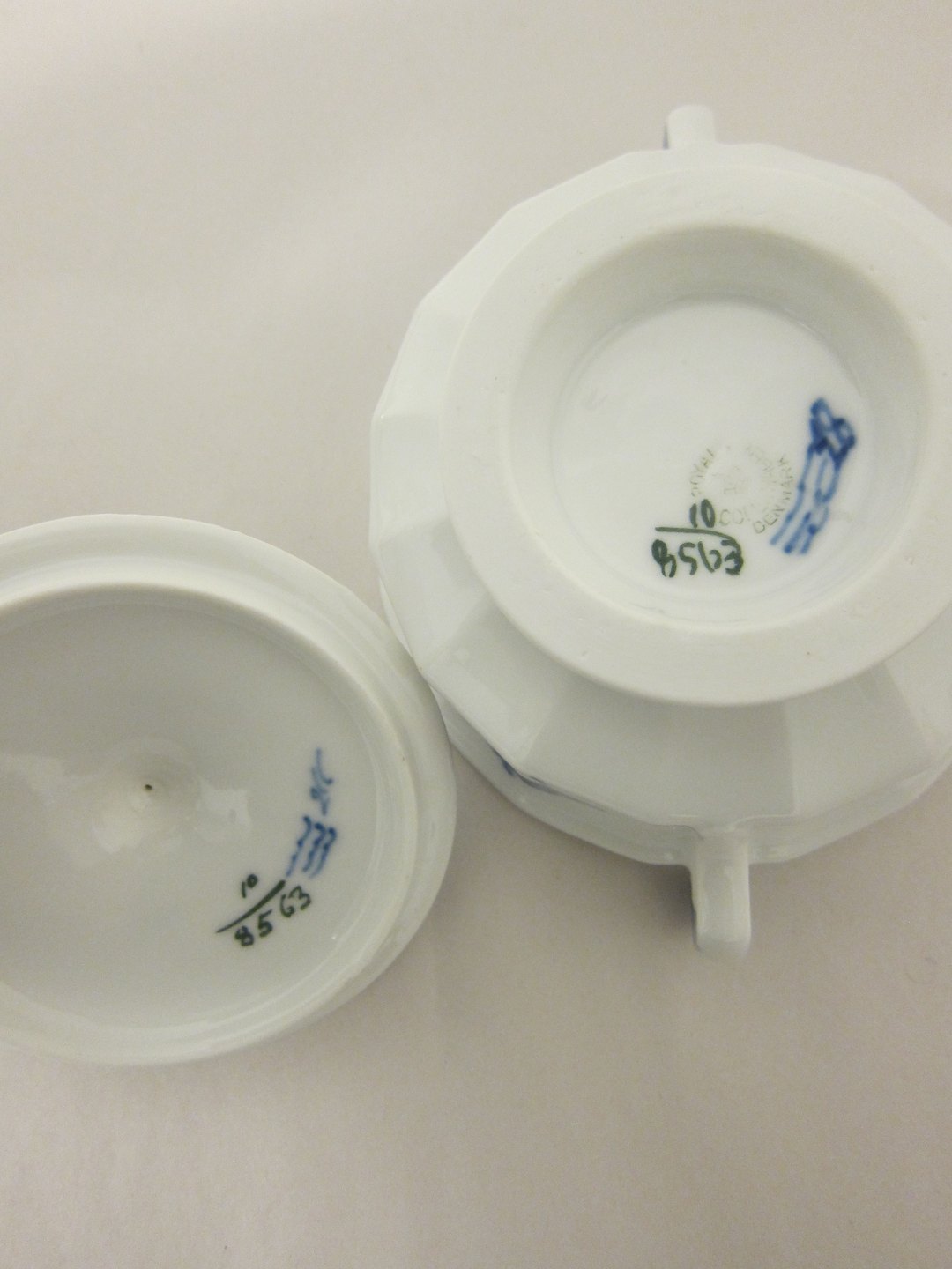 Kongelig/RC-nr. 8563 (Sugar basin with a lid - 2. grade) 8564 (cream jug- 1. sortering) og 8578 (tray - 2. sortering)
