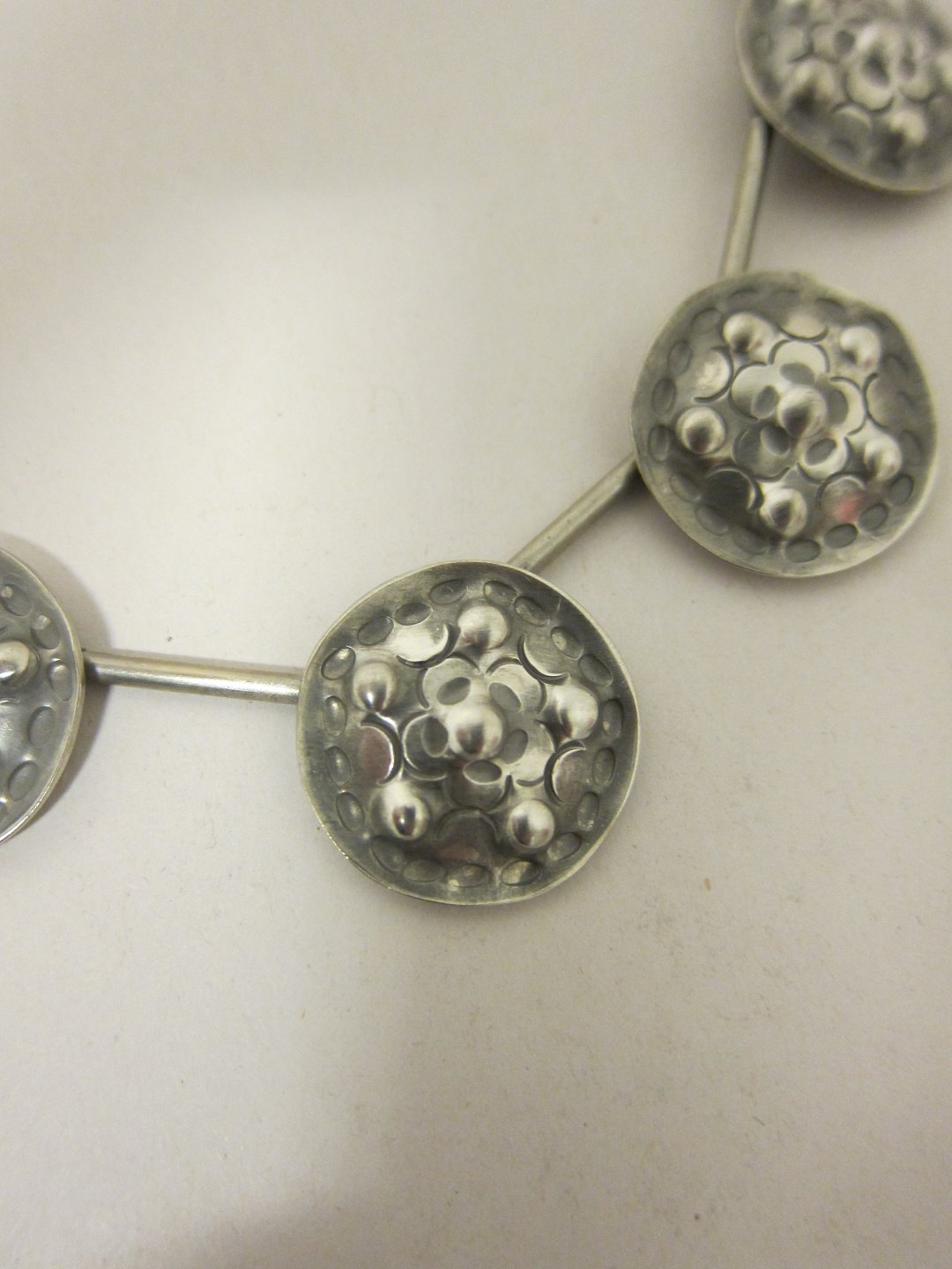 Halskæde, leddelt, af Tin Vintage smykker (halskæden til højre er solgt) Stemplet: Jørgen Jensen Denmark Pewter Handmade Design: Jørgen Jensen Vi har et bredt udvalg af tinsmykker Kontakt os for yderligere information Varenr.: 5154