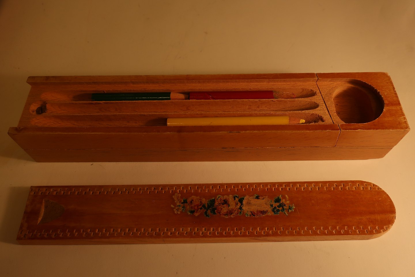 Gammelt træ-pennalhus/pennehus med træudskæring samt påklistret blomsterdekoration