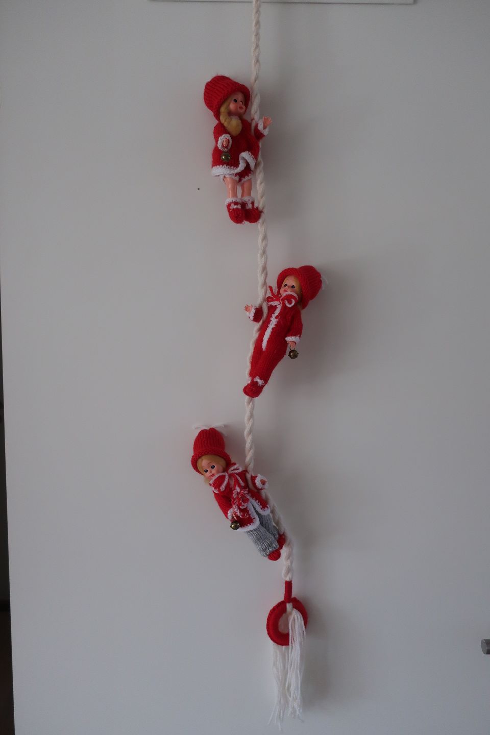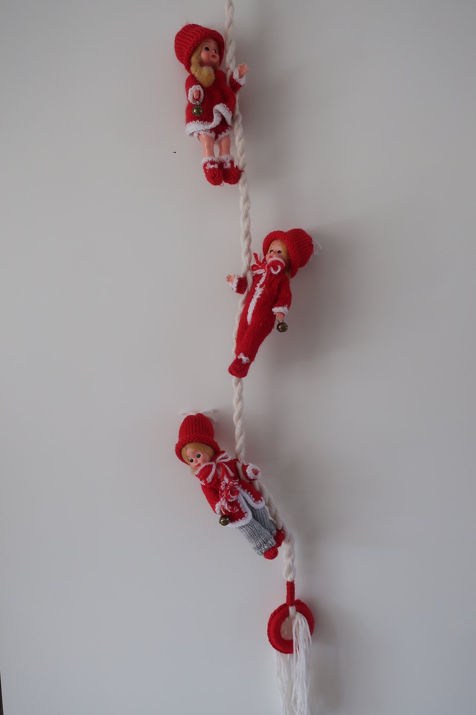 3 pixies on a string with handmade clothes H total: 134cm Each pixie 18-20cm høje Set of 3 pixies on a string In a very good condition Articleno.: KM1005